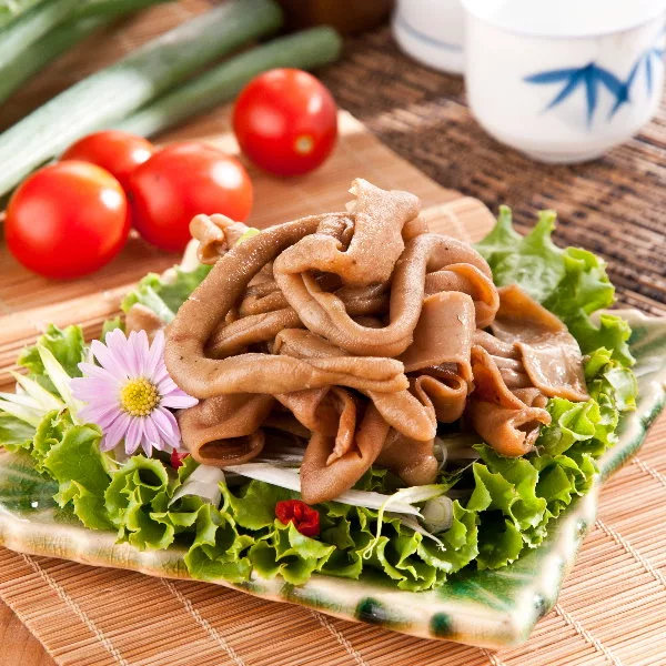 徹底洗淨處理之後,慢火滷製,包裹著濃郁滷汁口感一致、脆而不韌的脆腸,爽脆具嚼勁口感。再切成段狀方便食用。